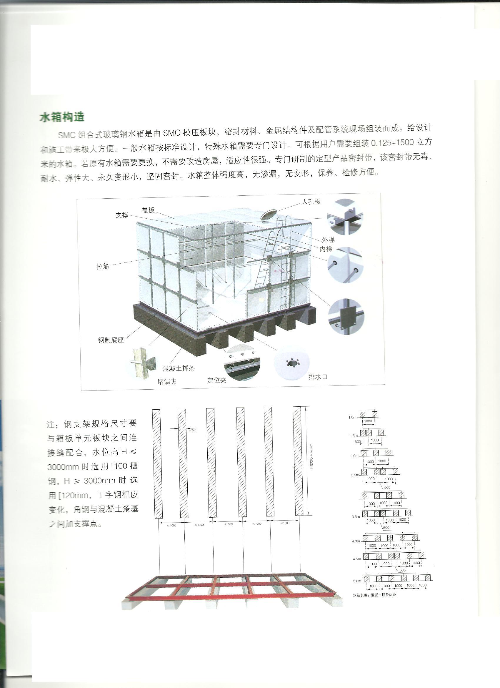 SMC玻璃钢水箱以重量轻、无锈蚀、不渗漏、水质好、使用范围广、使用寿命长、保温性能好,外形美观、安装方便、清洗维修简便、适应性强等特点,广泛应用于宾馆饭店、学校、医院、工矿企业、事业单位、居民住宅、办公大楼,是作为公共生活用[1]、消防用水和工业用水贮水设施的理想产品。水箱是工矿企业、民用住宅等公共供水系统不可缺少的组成部分。目前我国主要采用混凝土和钢板水箱,但混凝土水箱的渗漏、结垢,钢板水箱的锈蚀,对水箱的使用造成很大影响,目前水箱供水系统,由于水箱的菌藻、锈蚀污染而无法达到供水水质标准。 自八十年代,普遍采用组装式玻璃钢水箱,解决了上述问题,玻璃钢(FRP)水箱具有无泄漏、无变形、无污染、使用寿命长等优点,并且组装容易、外形美观,可根据用户需要组装成不同吨位的水箱。